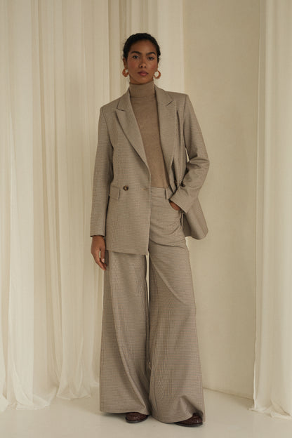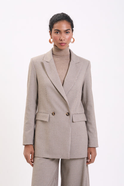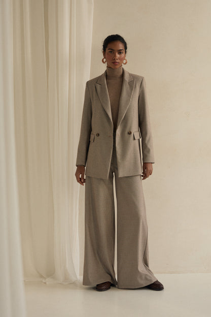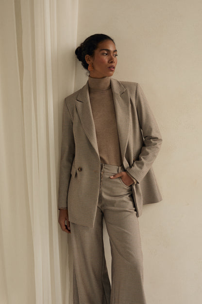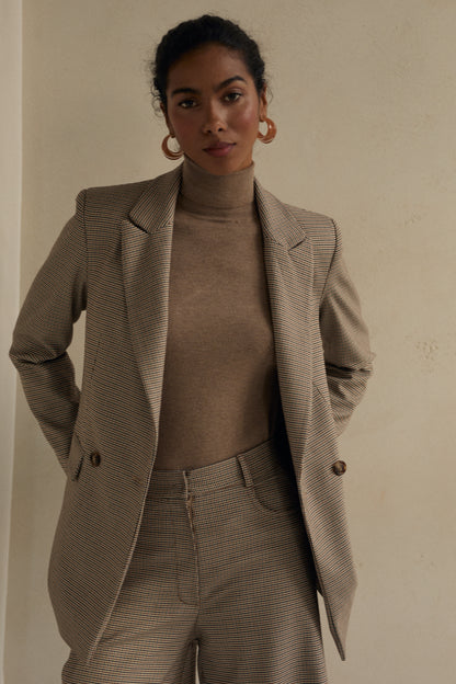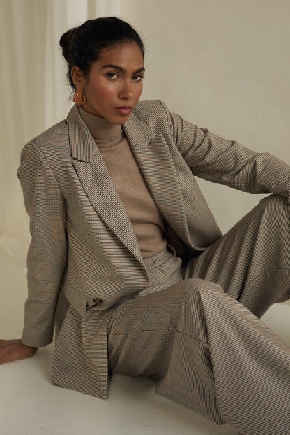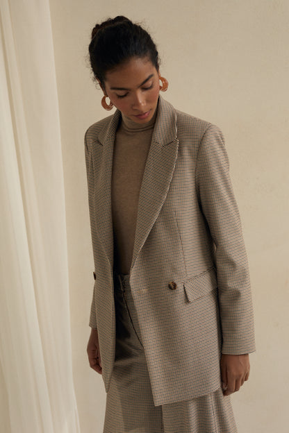 The new Osaka blazer is a nod to classic style at its best, perfect for autumn. Crafted from a subtle houndstooth fabric combining shades of beige, brown, and black, it exudes elegance and timeless style. Its simple, geometric cut flatters the silhouette and adds a refined touch to the overall look.
