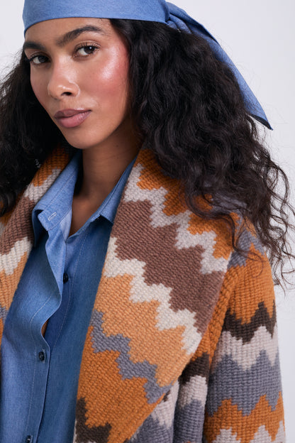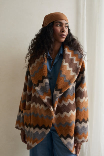 Cozy Autumn Megeve to kardigan, który otuli Cię w każdy chłodniejszy dzień. Wykonany z miękkiej, wełnianej tkaniny w ciepłych odcieniach brązu, karmelu i beżu, zachwyca swoją przytulnością i ponadczasowym stylem. Oversizowy krój sprawia, że możesz nosić go zarówno jako swobodny sweter, jak i jako płaszcz, tworząc elegancką, jesienną stylizację. To kardigan, który łączy komfort, przytulność i elegancję – idealny towarzysz na długie jesienne spacery i wieczory pełne ciepła.