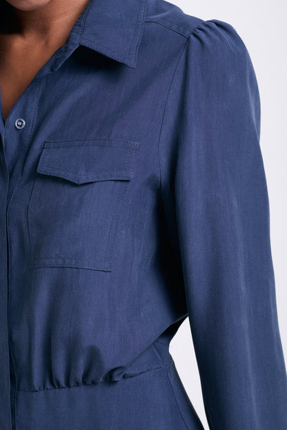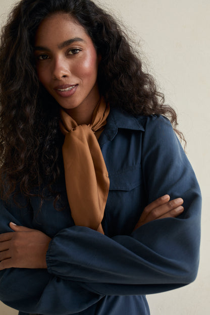 Sukienka Erin to połączenie subtelnej kobiecości i jesiennej lekkości. Wykonana z zwiewnej, delikatnej tkaniny w głębokim granacie, pięknie układa się na sylwetce, otulając ją w subtelny sposób. Prosty, szmizjerkowy krój z delikatnymi kieszonkami, rękaw 3/4 i subtelny kołnierzyk dopełniają całości, a zatrzaski na całej długości pozwalają regulować dekolt i rozporek według własnych potrzeb. Idealna do pracy, na miasto czy weekendowy wypad, Erin jest sukienką, która łączy komfort noszenia z ponadczasowym stylem – kwintesencja Just Paul w jesiennej odsłonie.