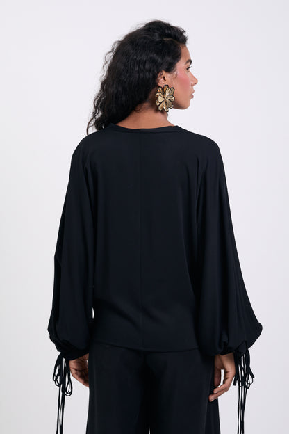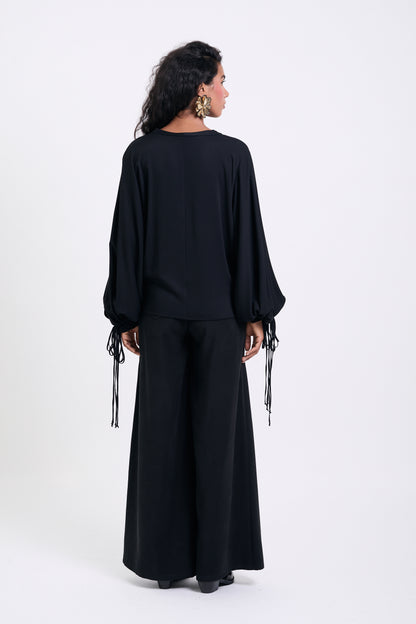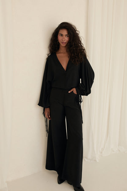 Koszula Ariane to kwintesencja elegancji i wyrafinowanego stylu. Wykonana z miękkiej, luksusowej tkaniny w głębokiej czerni, pięknie układa się na sylwetce, dodając każdej stylizacji klasy i szyku. Dekolt w kształcie litery V subtelnie podkreśla kobiecość, a bufiaste rękawy zakończone sznurkami można stylizować na kilka sposobów – przewiązane na nadgarstkach, związane w kokardkę lub noszone swobodnie. To koszula, która doskonale sprawdzi się zarówno w eleganckich, jak i codziennych jesiennych zestawieniach, wprowadzając nutę luksusu i szyku do każdej stylizacji.