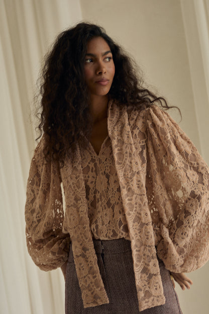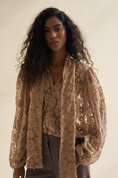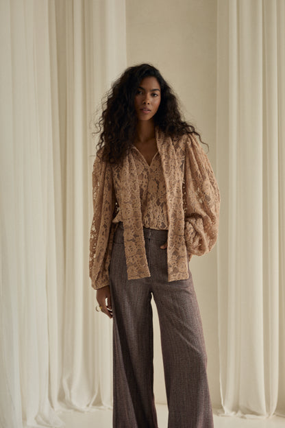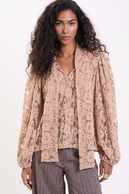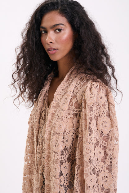 Nowa Nonna to kwintesencja subtelnej elegancji i romantycznego uroku. Uszyta z wyjątkowej, beżowej koronki o misternym splocie, zachwyca swoją lekkością i delikatnym prześwitem. Każdy detal od finezyjnego wykończenia po miękką linię rękawów sprawia, że koszula wygląda niezwykle kobieco i ponadczasowo.