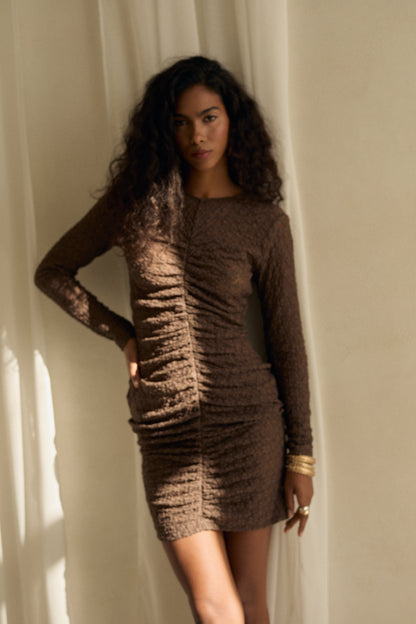 Sukienka Arles Dress to esencja kobiecości w ciepłym, jesiennym wydaniu. Uszyta z przepięknej, brązowej koronki. Zachwyca swoją strukturą i detalami. Marszczenia biegnące wzdłuż przodu i tyłu optycznie wysmuklają sylwetkę, podkreślając jej kształt w najbardziej delikatny sposób.