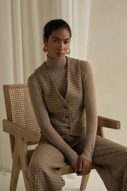 Krótka kamizelka to mała forma o wielkim stylu. Uszyta ze szlachetnej tkaniny w pepitkę łączącą odcienie karmelu, brązu, miedzi i beżu, doskonale wpisuje się w klimat ciepłej, eleganckiej jesieni.
