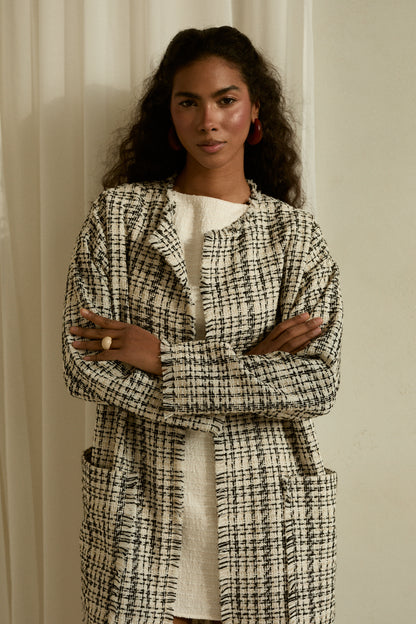 Na Waszą prośbę: model Florence wraca do kolekcji w wiosennej odsłonie. Długi, prosty płaszczyk w bieli z czarną kratką i subtelną połyskującą nitką, z lekko opruwanymi wykończeniami i dwiema kieszeniami. Wyrazisty, ponadczasowy i bardzo Just Paul.