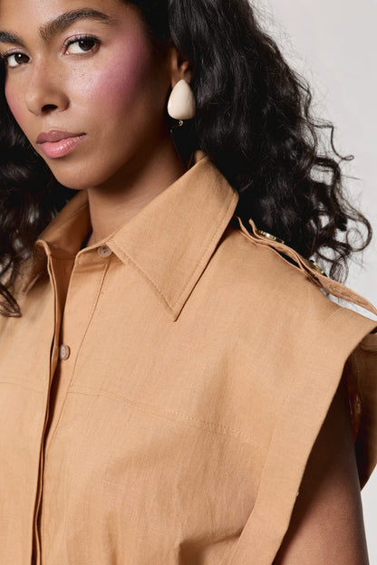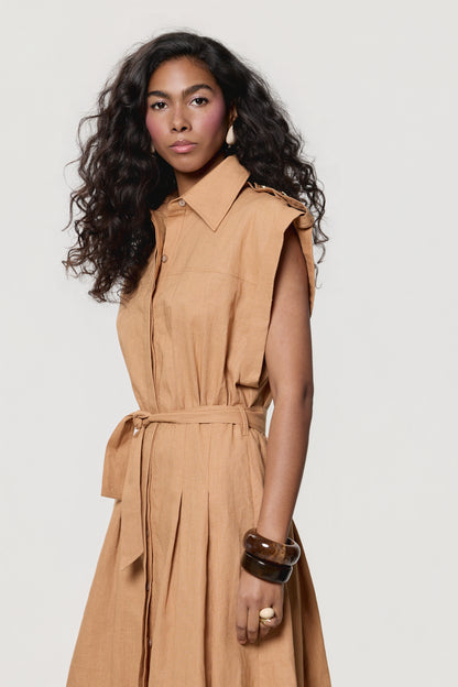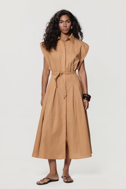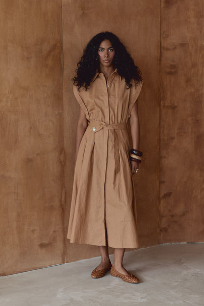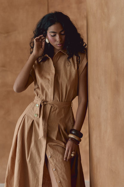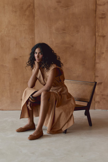 Minimalizm z nutą wyrafinowania. Sukienka Francis w ciepłym, karmelowym odcieniu zachwyca prostą formą i dopracowanymi detalami. Zapinana na guziki, z szerokim rękawem wzbogaconym o dyskretną wstawkę zapewniającą komfort noszenia. Pasek podkreśla talię i nadaje sylwetce lekkości. Idealna na lato – elegancka, swobodna i niezwykle stylowa.