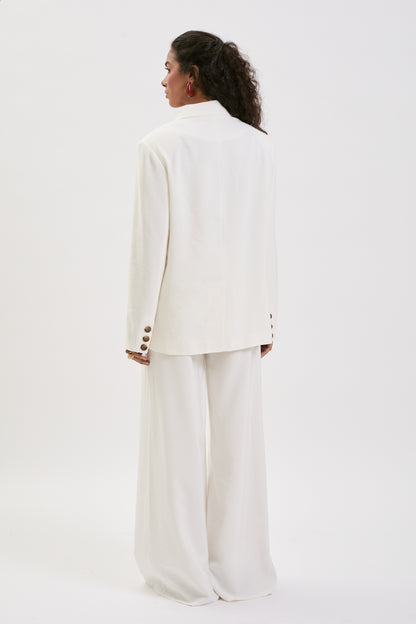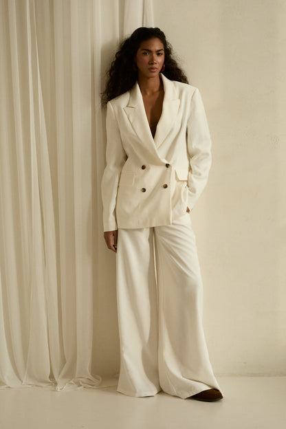 Spodnie o subtelnie lnianej strukturze i naturalnym, oddychającym wykończeniu. Odcień złamanej bieli nadaje całości świeżości i elegancji. Model z wysokim stanem i rozszerzaną nogawką optycznie wydłuża sylwetkę, zachowując lekkość i swobodę ruchu. Tkanina miękko układa się na ciele, tworząc harmonijną, dopracowaną linię.