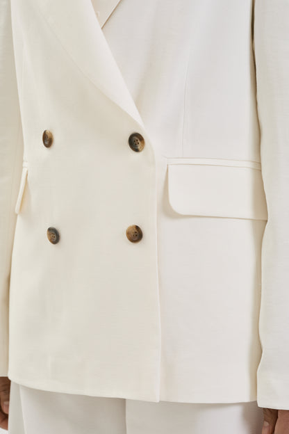 Klasyczna marynarka o kroju dwurzędowym w odcieniu złamanej bieli. Uszyta z lekkiej, lnianej w wyrazie tkaniny o subtelnej, naturalnej fakturze, która nadaje jej szlachetnego charakteru i sprawia, że idealnie sprawdza się w wiosennych stylizacjach. Tworzy spójny komplet ze spodniami Milky Mist Flared, ale stanowi również ponadczasową bazę do wielu stylizacji.