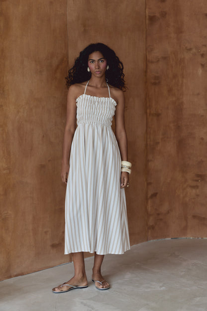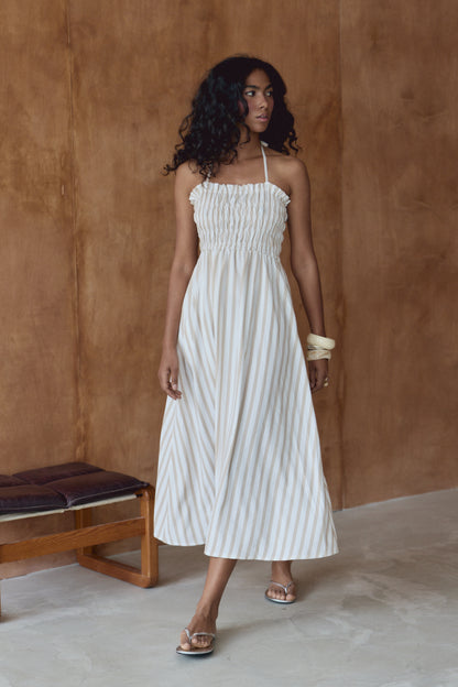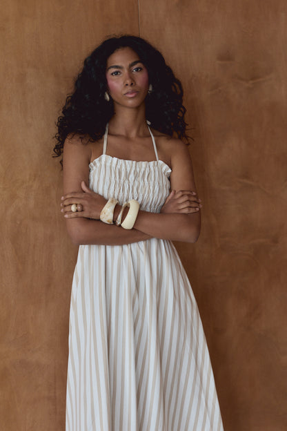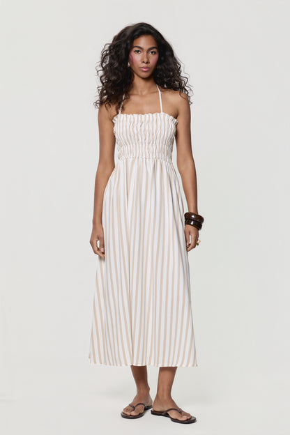 Naturalna lekkość i ponadczasowa elegancja. Sukienka Abia w beżowo-białe paski to idealny wybór na letnie dni – subtelna, świeża i niezwykle kobieca. Góra z elastycznych gumek pięknie podkreśla sylwetkę, a wiązanie na szyi pozwala dopasować fason do własnego stylu lub całkowicie je ukryć. To komfort i styl w najczystszej formie.