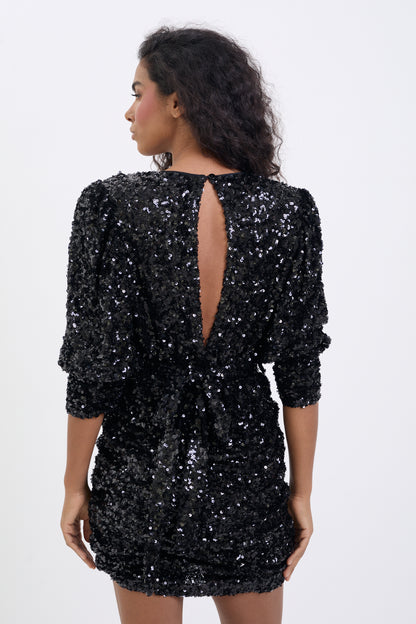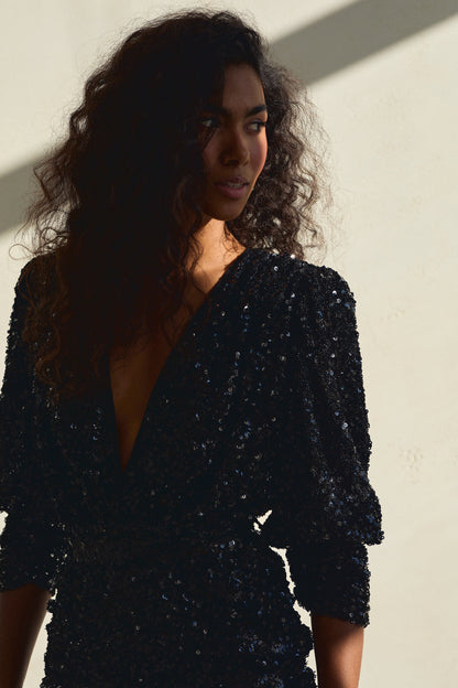 Ta cekinowa mini to propozycja, która nie pozostaje w cieniu. Uszyta z tkaniny pokrytej głębokimi, czarnymi cekinami, zachwyca intensywnym blaskiem i zmysłowym charakterem, idealnym na nadchodzący sezon pełen światła i celebracji.
