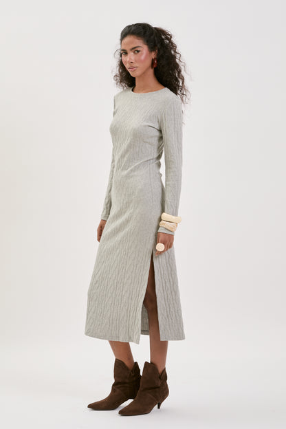 Nowa sukienka Nelia w jasnym, szałwiowo-szarym odcieniu z delikatnym pionowym splotem. Dopasowany krój midi z rozcięciem po jednej stronie podkreśla sylwetkę i nadaje lekkości. Minimalistyczna elegancja w wiosennym wydaniu.