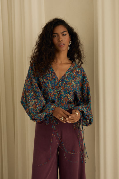 Nowa odsłona koszuli Ariane to połączenie elegancji i jesiennego spokoju. Uszyta z delikatnej, miękko układającej się tkaniny w głębokim granacie, zdobionej malarskimi mazami w odcieniach brązu i bordo przypominającymi liście spadające z drzew, zachwyca subtelnym urokiem i wyrafinowaniem.