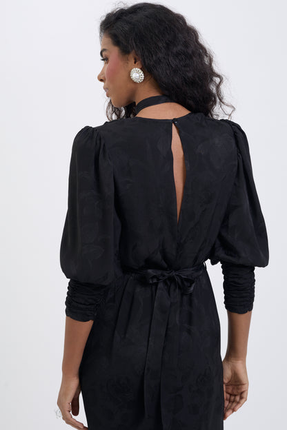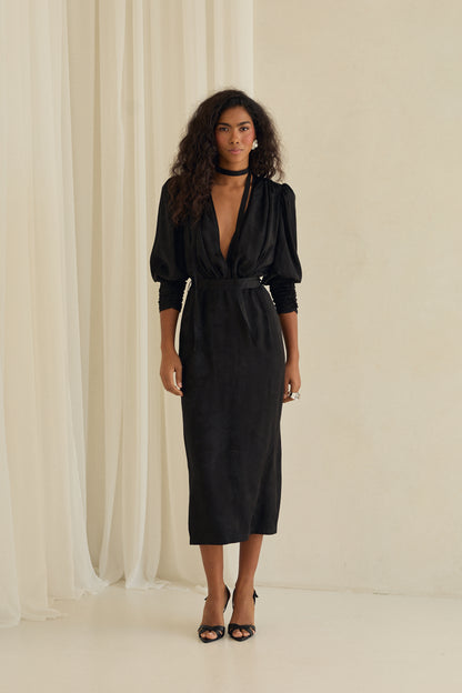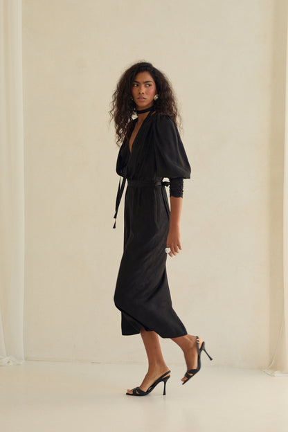 Kobiecy krój miękko układa się na sylwetce, podkreślając jej naturalne linie, a falujące wykończenia nadają całości eleganicznego, niezwykle płynnego rytmu. Do sukienki dołączone są dwa paski: jeden do przewiązania w talii, podkreślający kształt, oraz drugi wiązany na szyi, który możesz stylizować na różne sposoby, od delikatnej kokardy po zmysłowe luźne wiązanie.