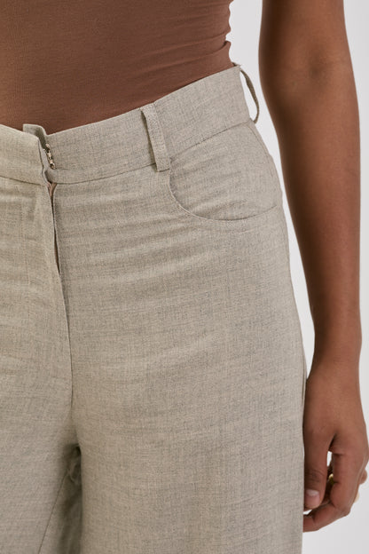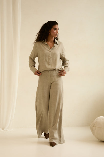Spodnie Flared w jasnym odcieniu khaki, uszyte z wyjątkowo lekkiej i miękkiej tkaniny o delikatnej, naturalnej strukturze. Materiał subtelnie pracuje w ruchu i zapewnia komfort noszenia przez cały dzień. Wysoki stan oraz rozszerzana nogawka optycznie wydłużają sylwetkę i nadają jej proporcji. Idealne w komplecie z koszulą Stone Taupe Offie z tej samej tkaniny.