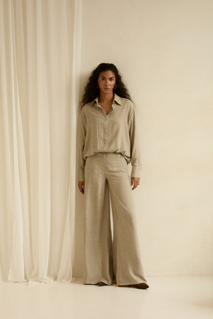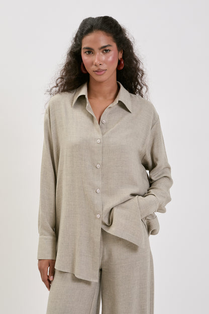 Koszula Offie wykonana z lekkiej, miękkiej tkaniny. Naturalna faktura materiału i jasny odcień khaki nadają jej subtelnej elegancji i świeżości. Swobodny fason z klasycznym kołnierzykiem i delikatnie wydłużonym tyłem zapewnia komfort oraz nowoczesny wygląd. Materiał pięknie układa się na sylwetce, tworząc spójny, minimalistyczny zestaw ze spodniami.